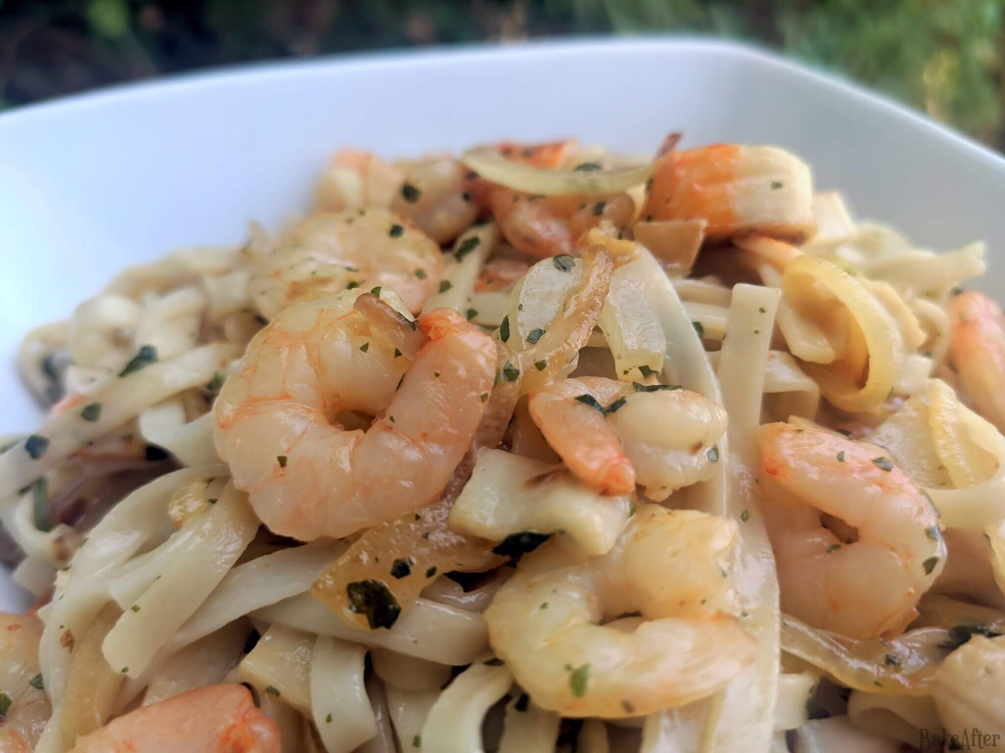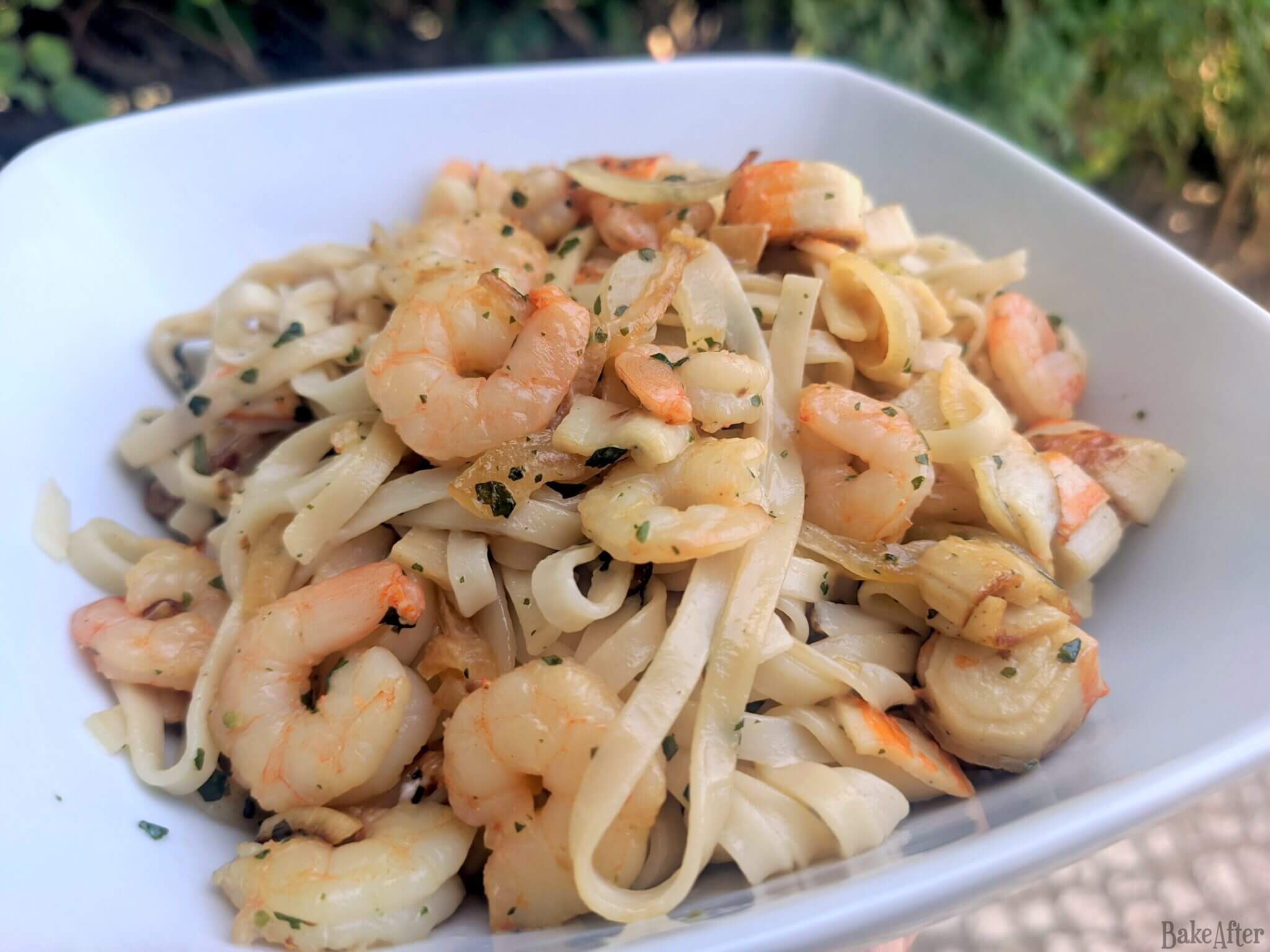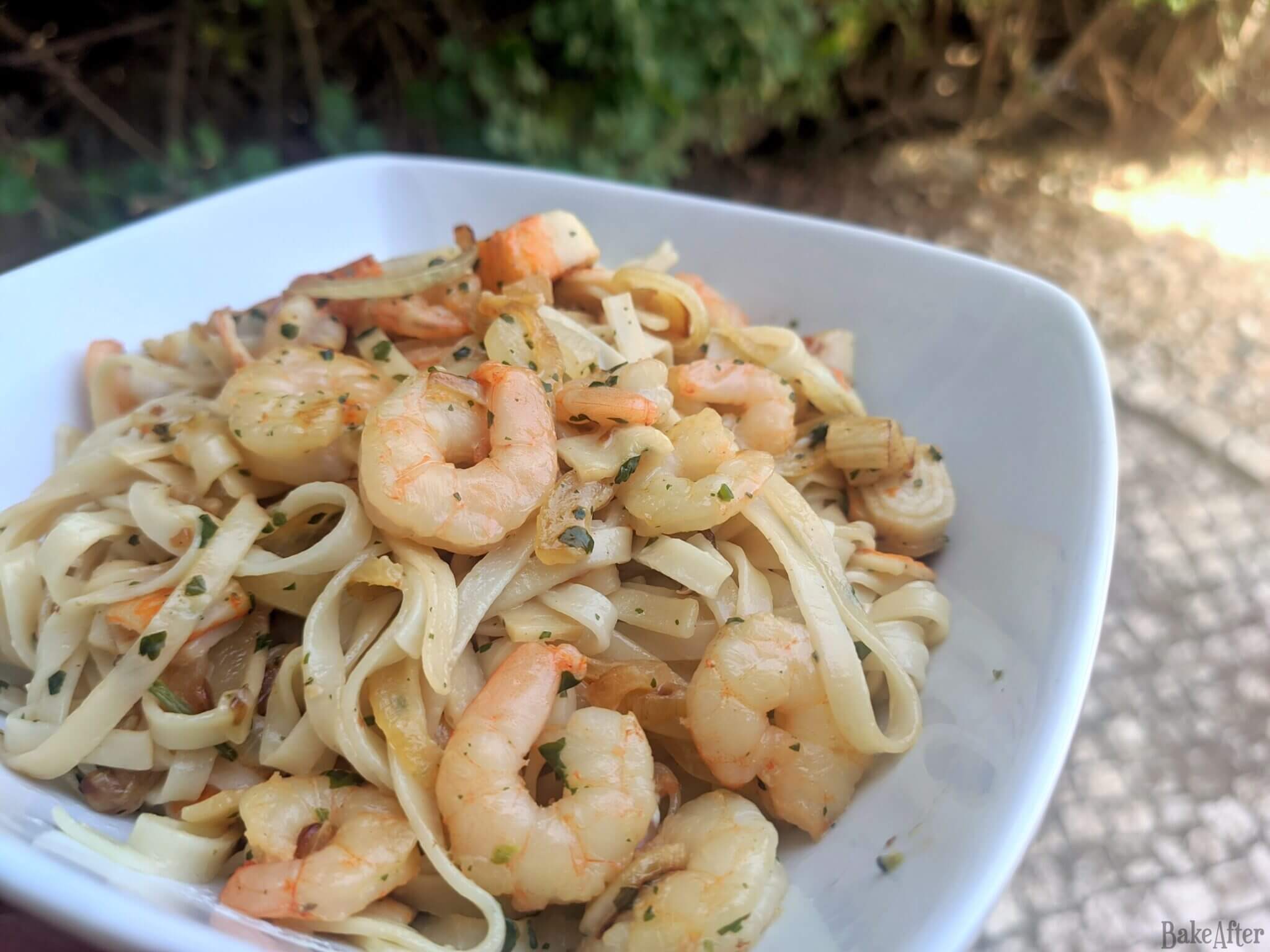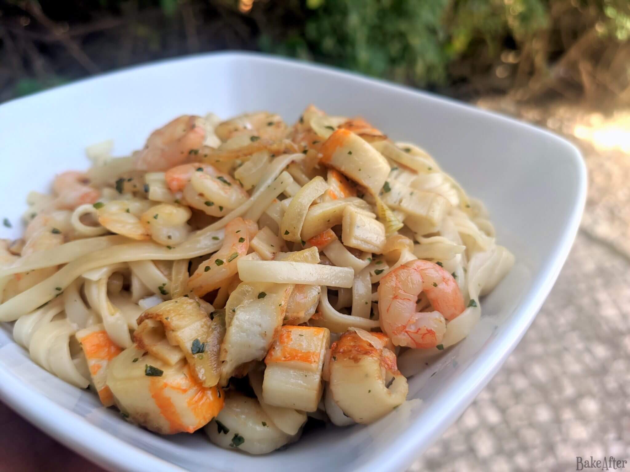 This recipe for Quick Garlic Shrimp and Imitation Crab Tagliatelle Pasta was originally created on BakeAfter.com. Esta receita de Tagliatelle de Delícias e Camarões foi publicada em português no Iguaria.com.