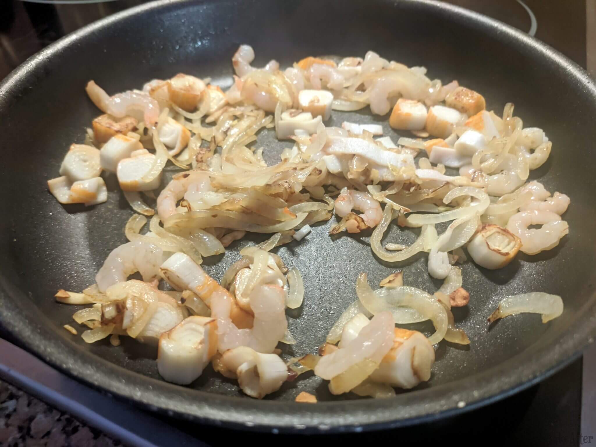 - Then add the shrimp and, depending on their size, fry for about 1 to 2 minutes on each side. When the shrimp are almost ready, add the sliced imitation crab, just to color and heat them up, and season everything with salt and pepper.