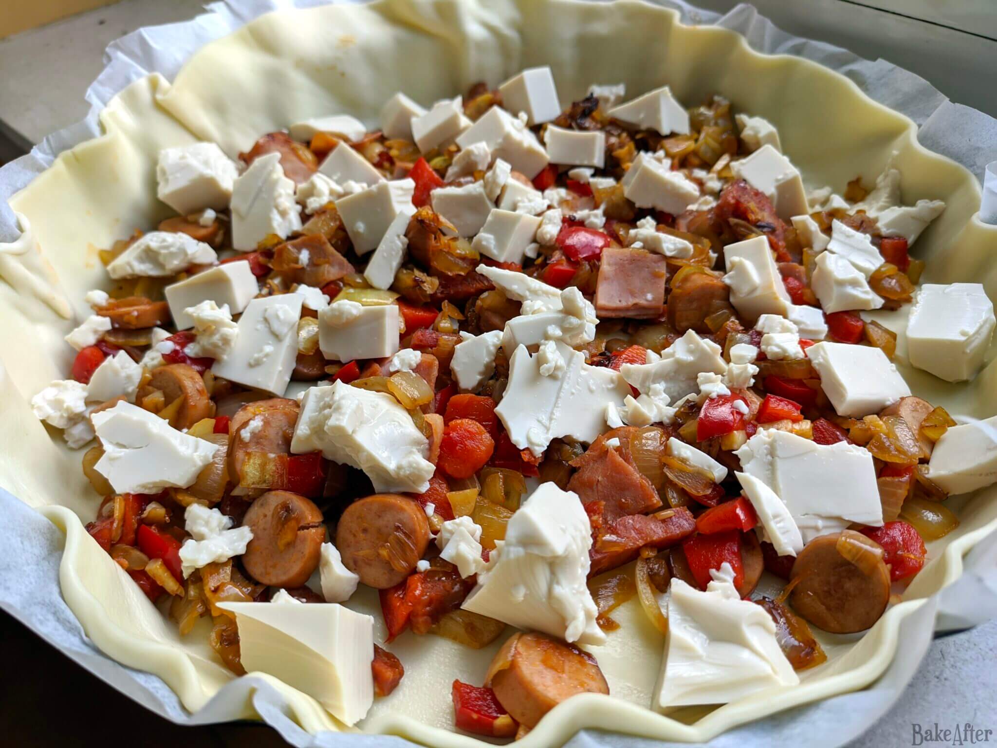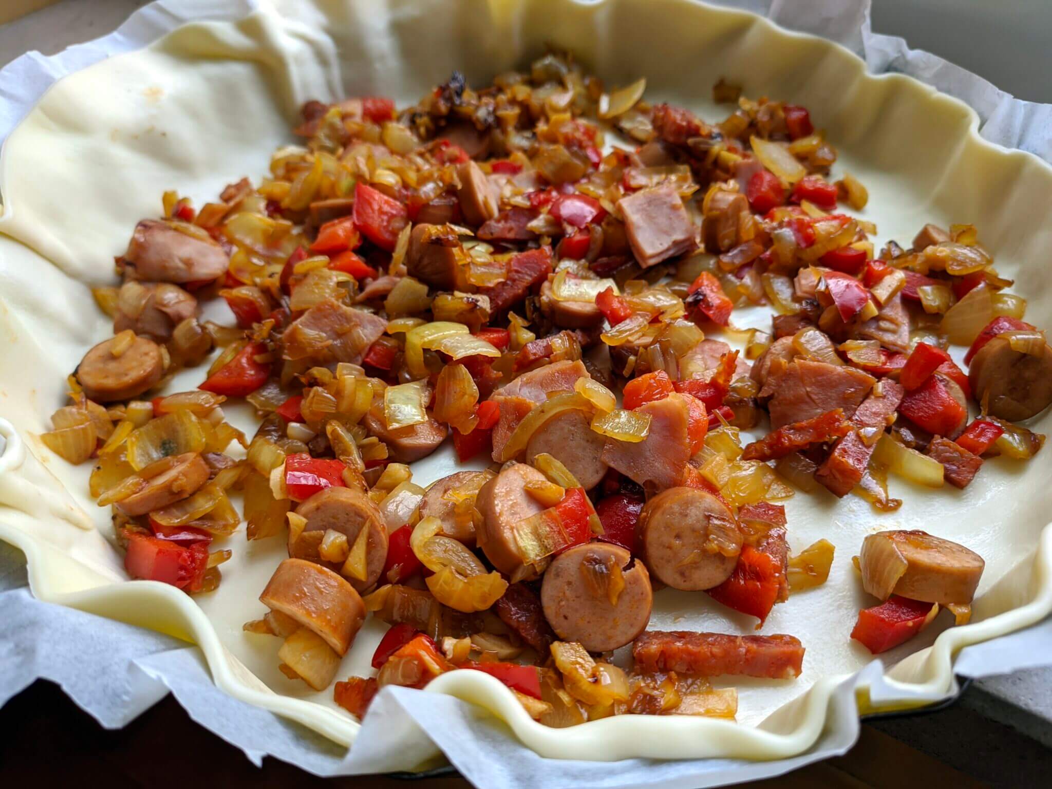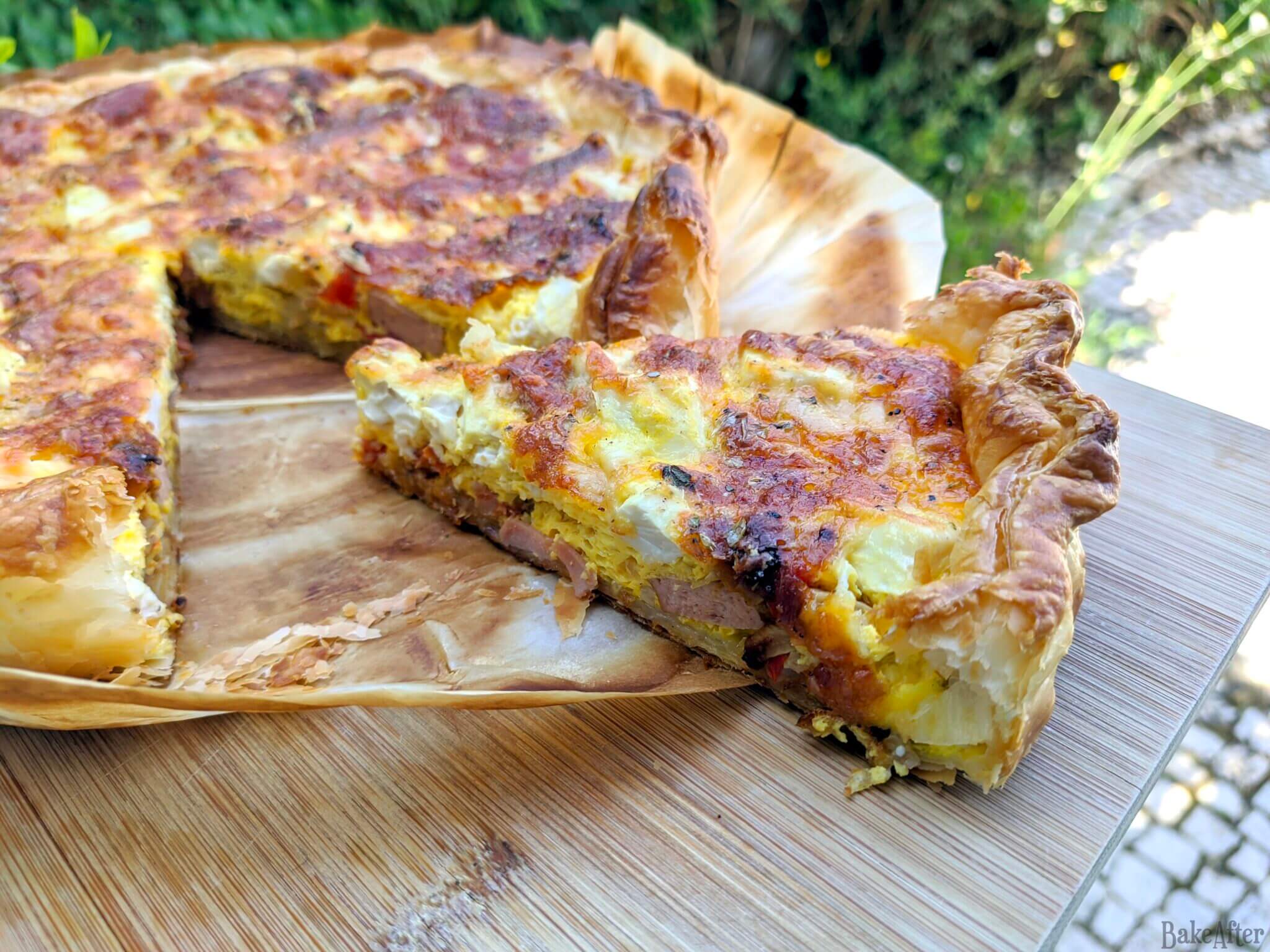 Who doesn’t love a beautiful quiche? It’s one of those dishes I make almost every time I have some leftovers of this or that and don’t quite know what to do with them. In those cases, it’s often either fried rice or a beautiful quiche. This time I had some leftover sausages, I think it was 1 or 2, half a package of firm tofu, and some leftover vegetables. You don’t need much more than that to make a quiche filling.