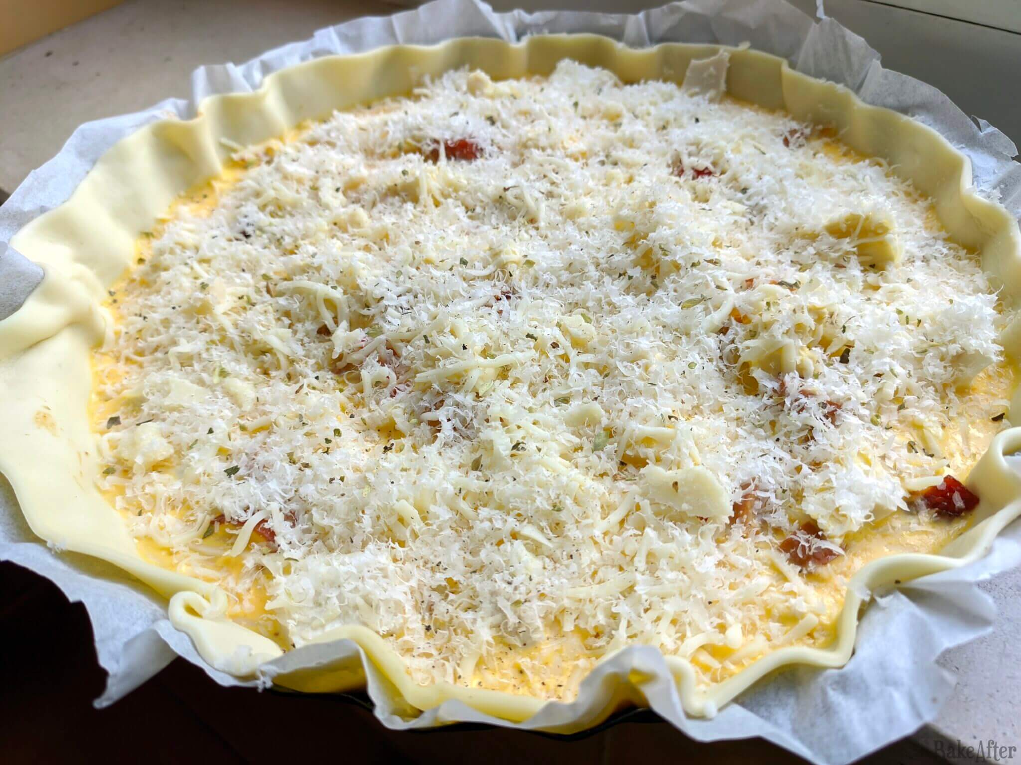 You can prepare the sautéed filling ahead of time and keep it refrigerated. Just bring it to room temperature before assembling the quiche.