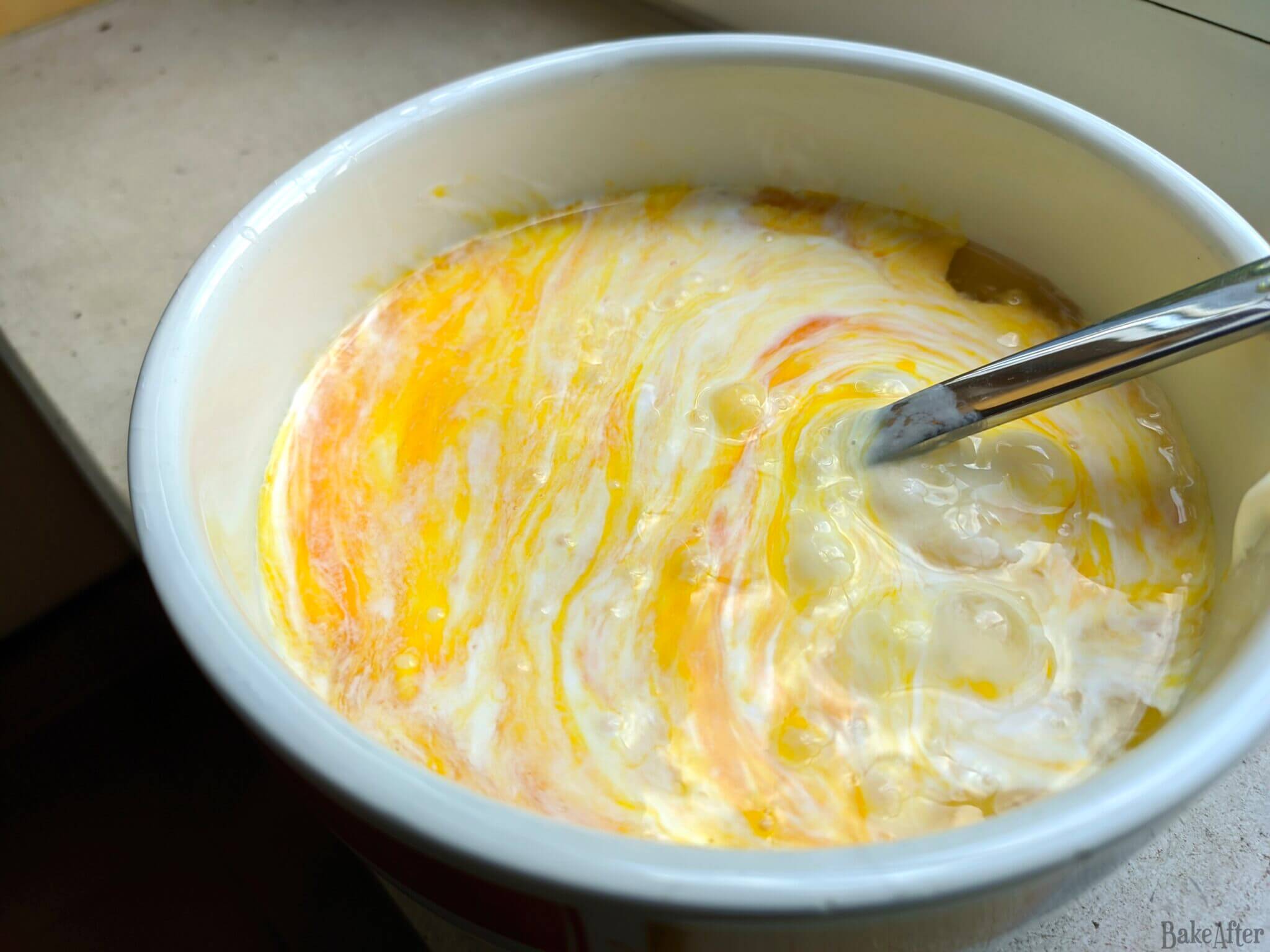 5. Whisk the eggs with the cream, season with salt and pepper, and pour over the mixture.