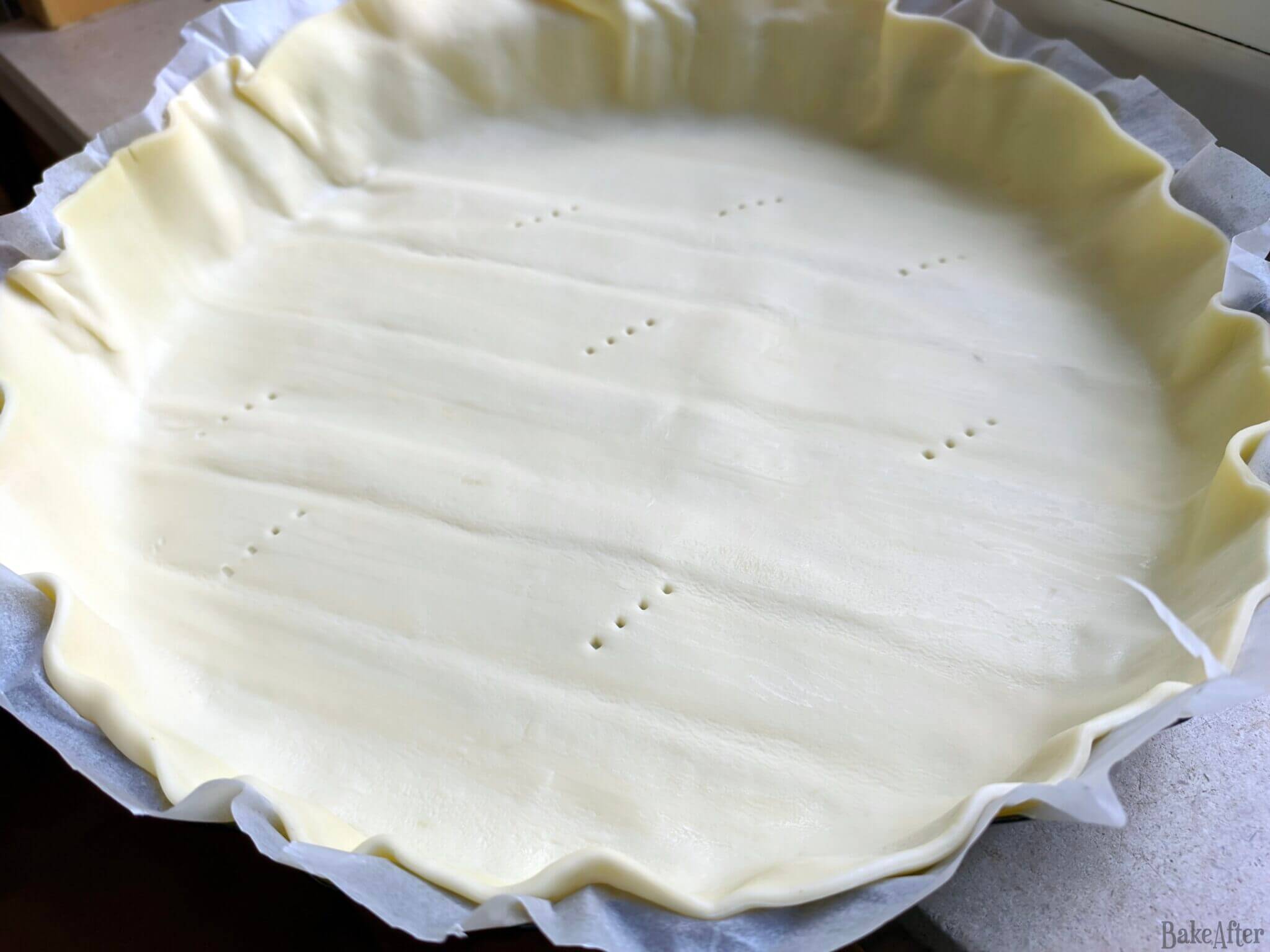 Pricking the bottom of the pastry (also called docking) helps prevent it from puffing up too much during baking and keeps your filling from getting uneven.