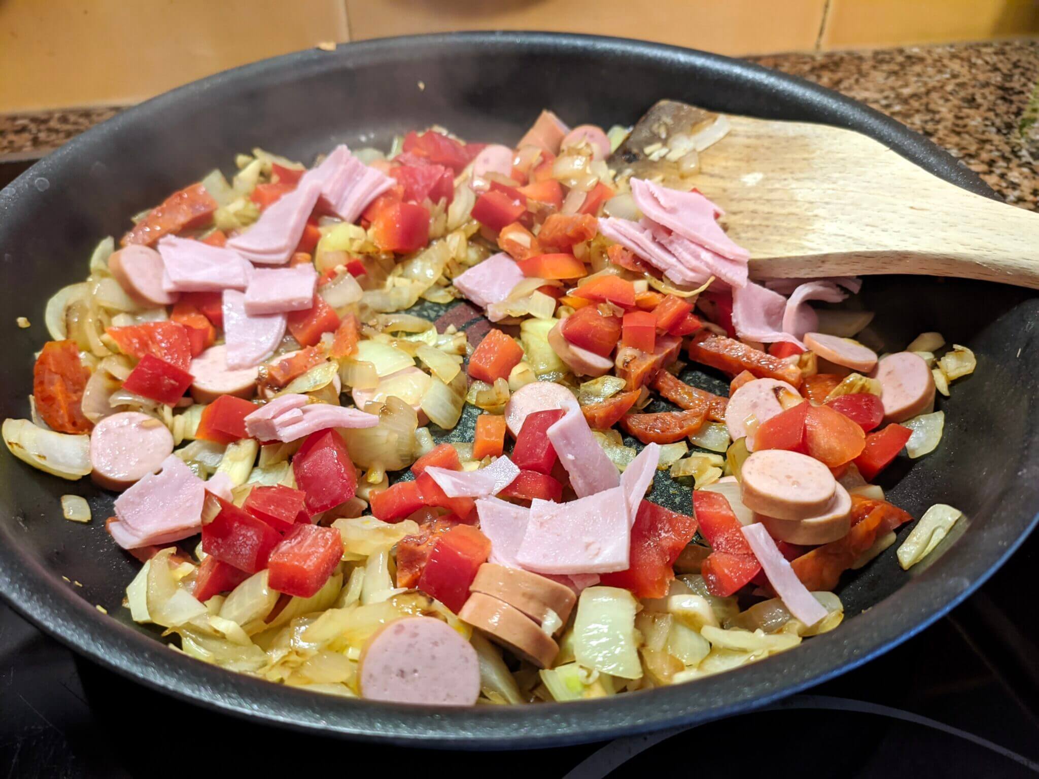 1. Start by starting a sautéing in a frying pan with a drizzle of olive oil, add the coarsely chopped onion, crushed garlic, chopped red pepper, chopped chorizo, sliced ham, and sliced sausages, and fry until everything is golden brown.