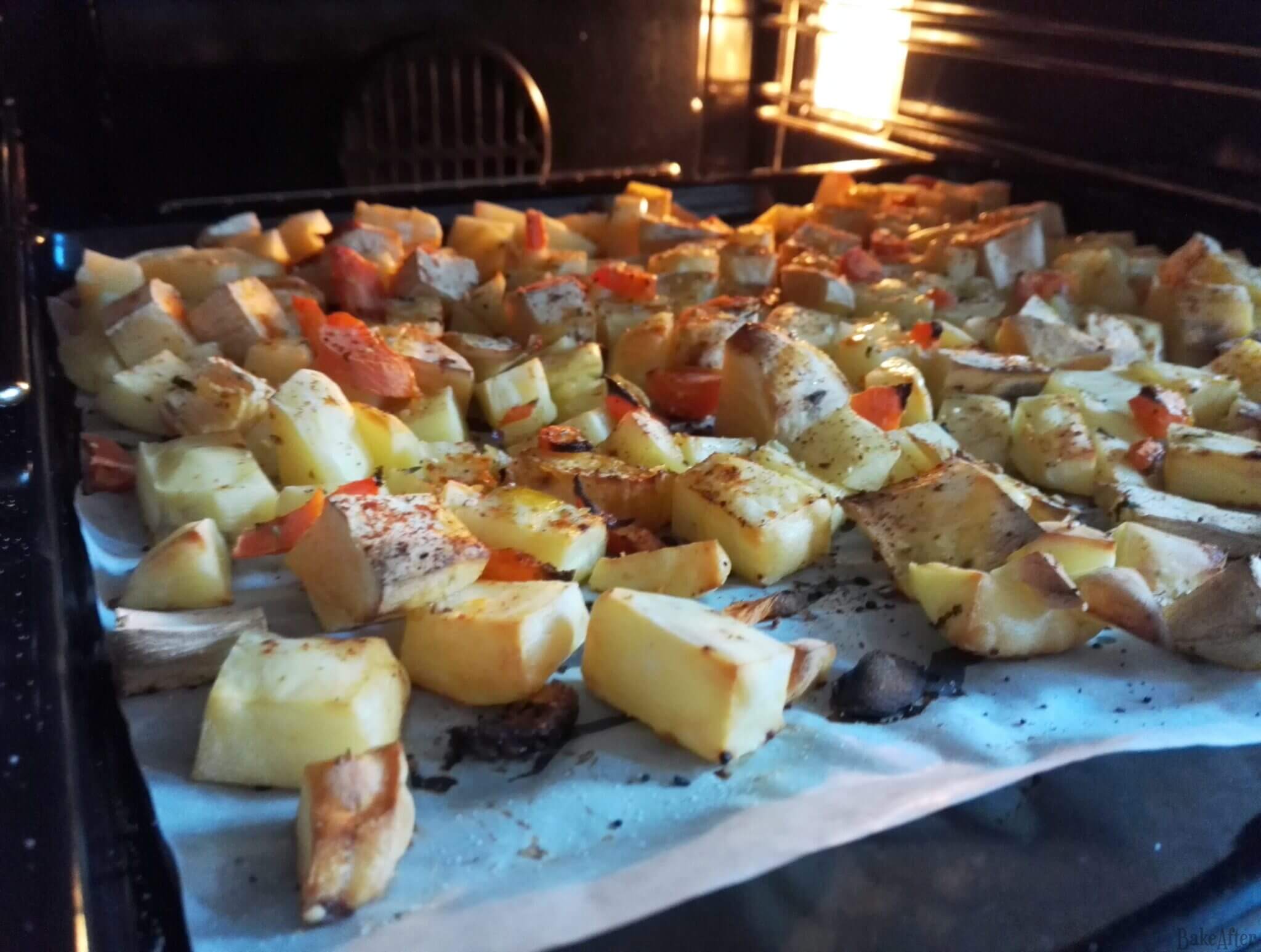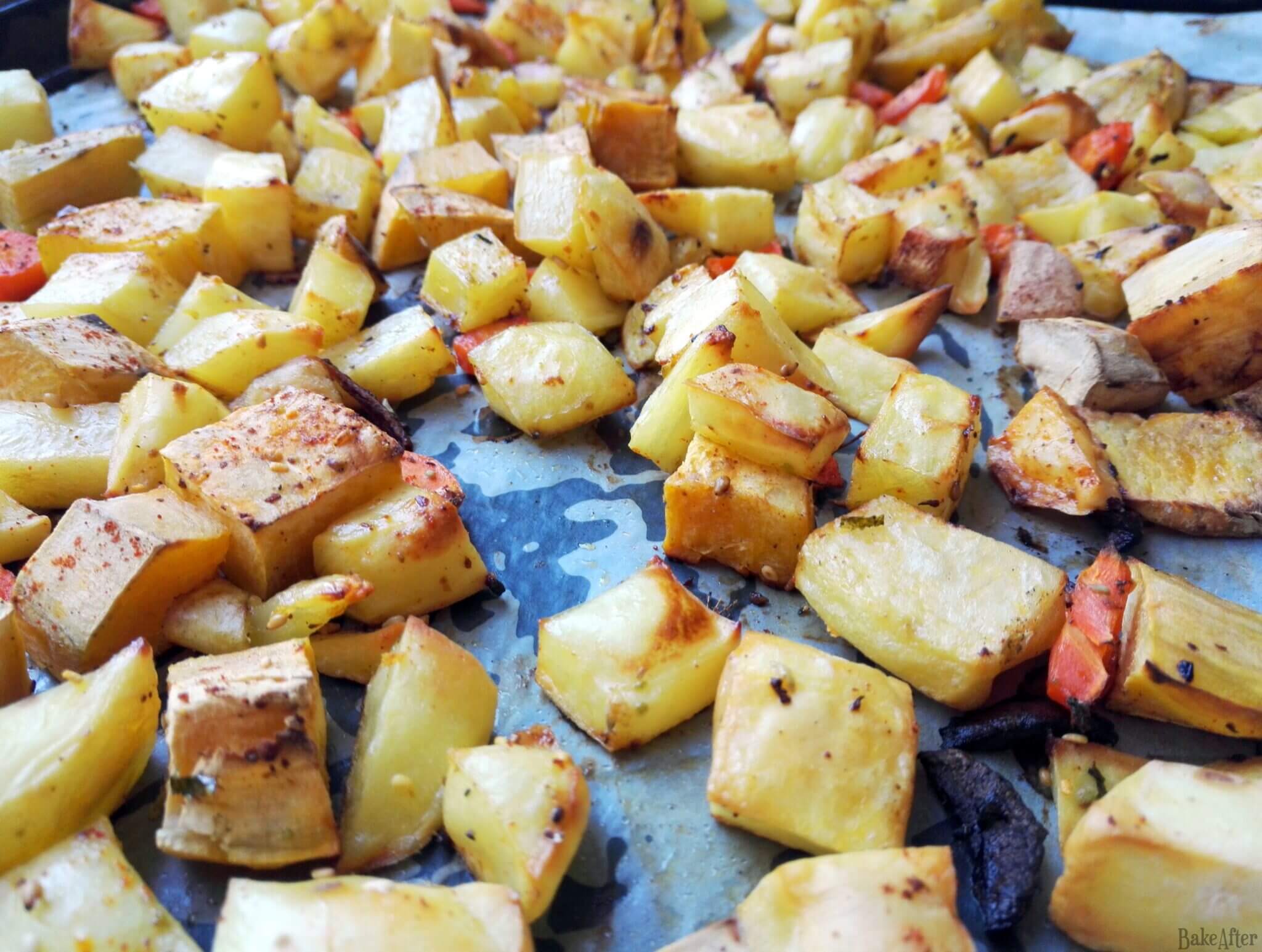 - Start by peeling the potatoes, sweet potatoes, and carrots, cut them into cubes, try and make the sweet potato cubes larger just because sweet potato roasts much faster than potato, and place them on a baking sheet lined with parchment paper. Season with a drizzle of olive oil, followed by a pinch of salt, paprika, and thyme.