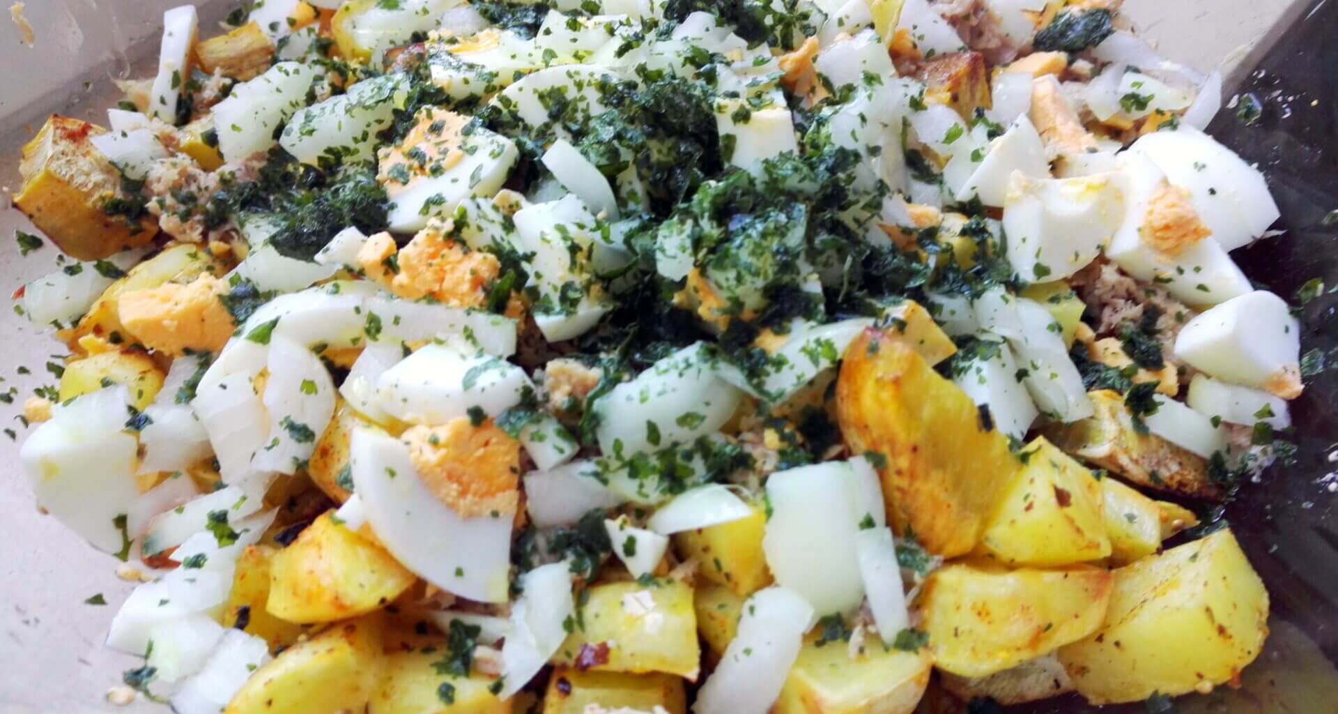 - When the potatoes are well roasted, remove them from the tray and place everything in a large serving bowl, add the chopped onion, chopped garlic, chopped eggs, some chopped coriander, and the flaked tuna.