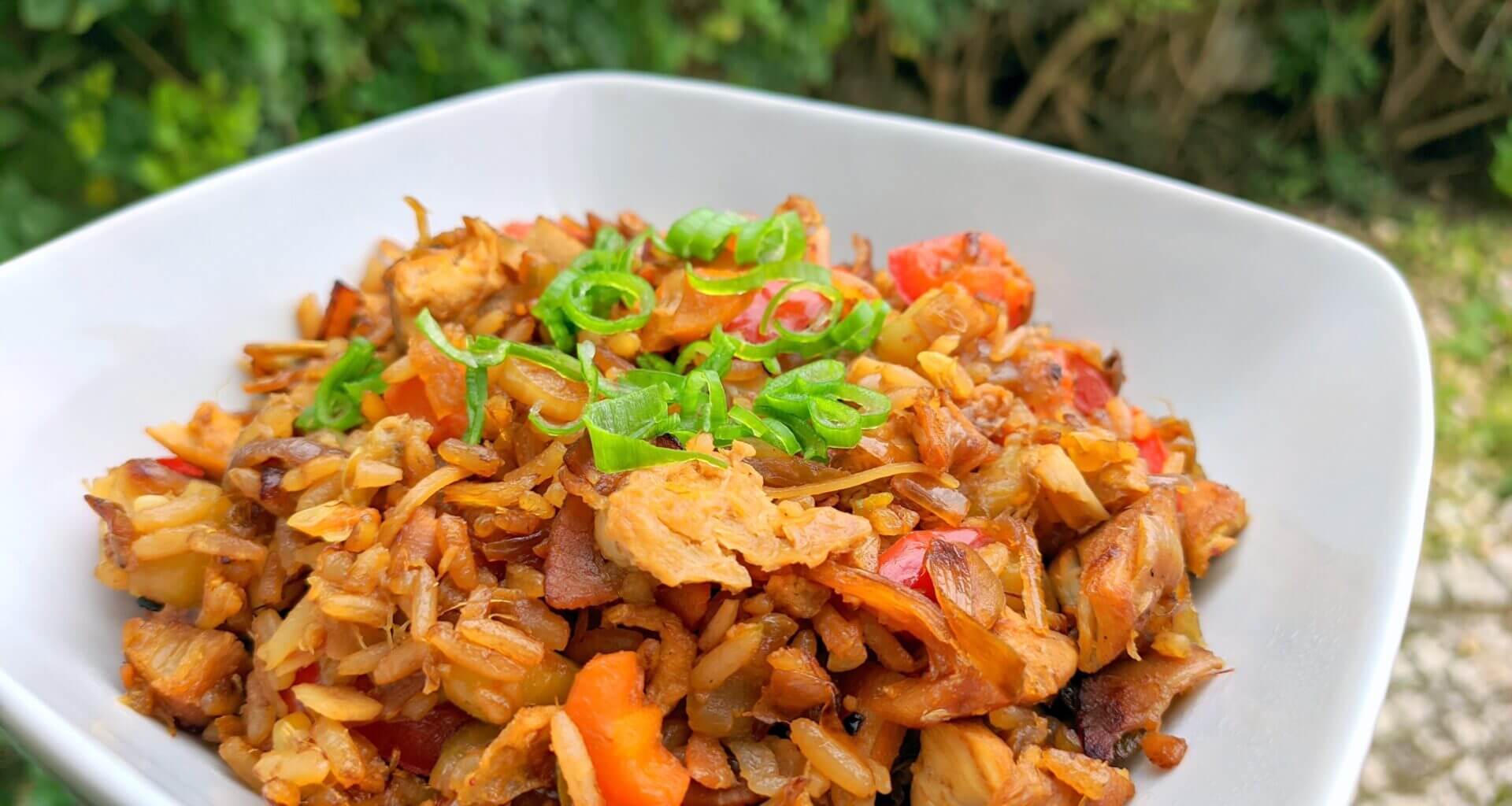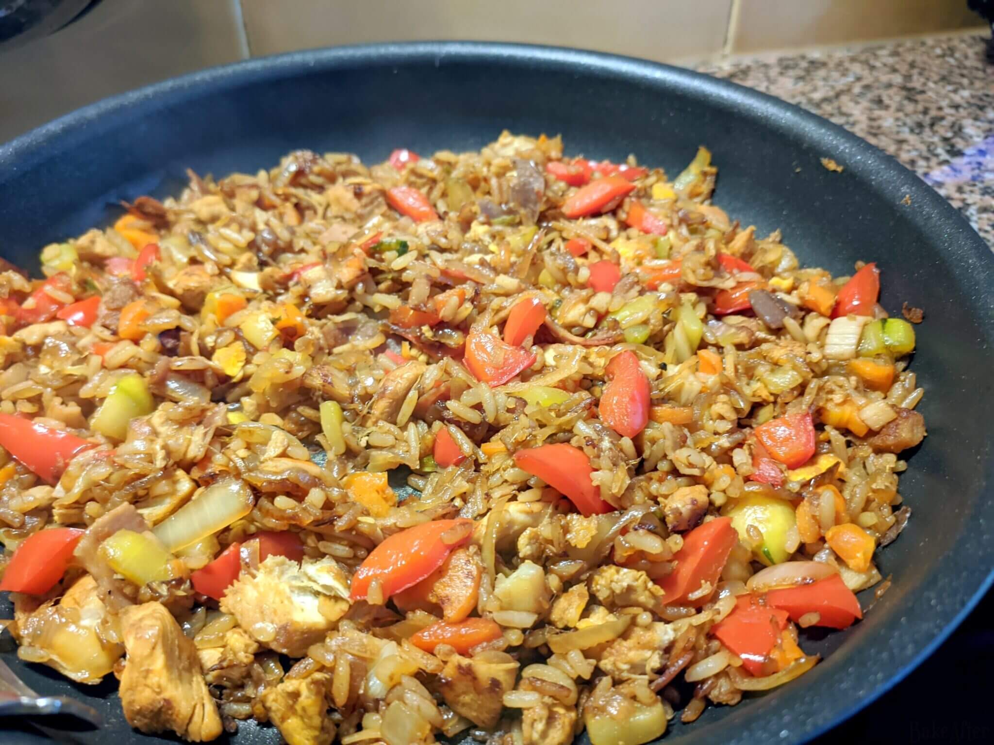 In this case I have a fried rice where I add a bit of teriyaki sauce instead of the more traditional soy sauce, obviously as you’d expect it turned out a bit sweeter, but I think it pairs well with the chicken pieces, since teriyaki with chicken is a very typical combination in Japanese cooking especially with yakitori (small skewers with chicken or meat seasoned with teriyaki sauce and grilled over charcoal or wood).