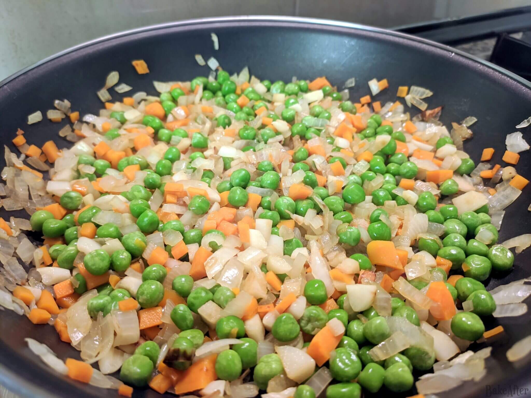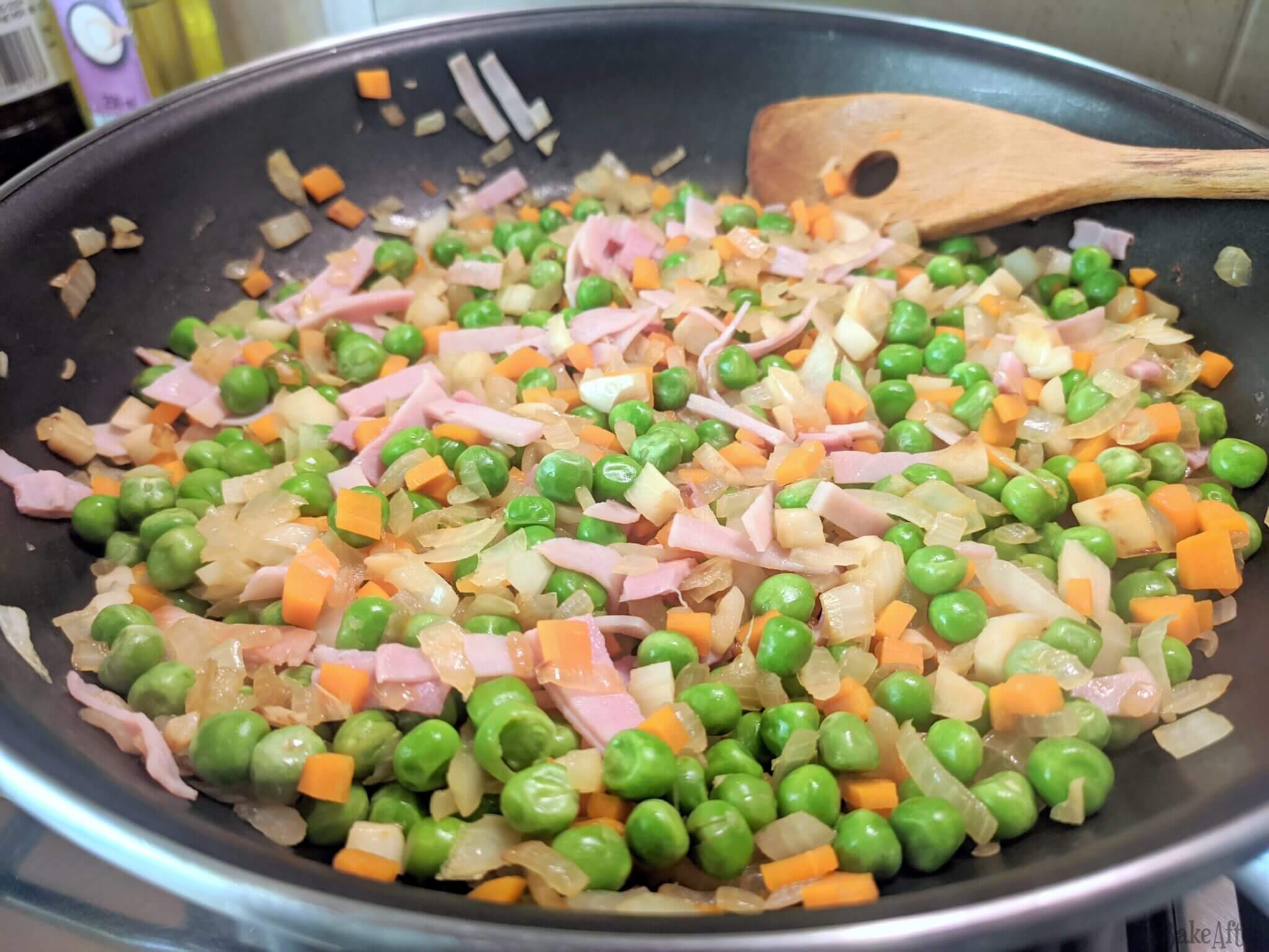 - When the onion is golden brown, add the ham and peas and cook for a few more minutes.