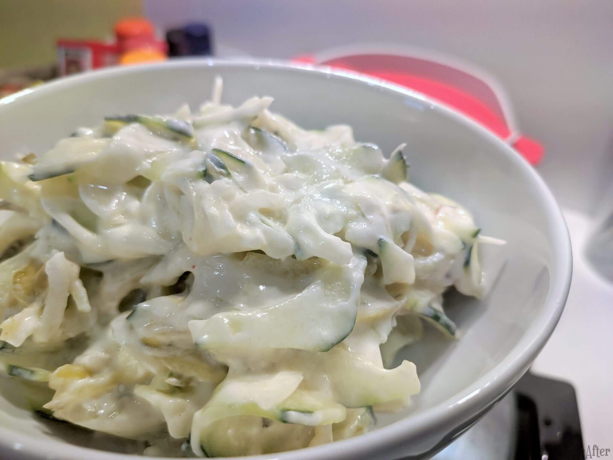 This is a variation of the classic Greek tzatziki sauce, and let me tell you, it’s the perfect side for a ton of things, from salads to sandwiches, grilled meats to crispy fries, and of course, stuffed into warm pitas. The big difference here is the texture. Instead of the typical finely minced approach, I slice everything super thin, almost like a mandoline situation, which gives you this gorgeous chunky-yet-creamy consistency that sits somewhere between a sauce and a salad. It’s got all that fresh cucumber crunch, punchy garlic, and tangy yogurt goodness EVERYONE CRAVES!!! No? Hehehehe…