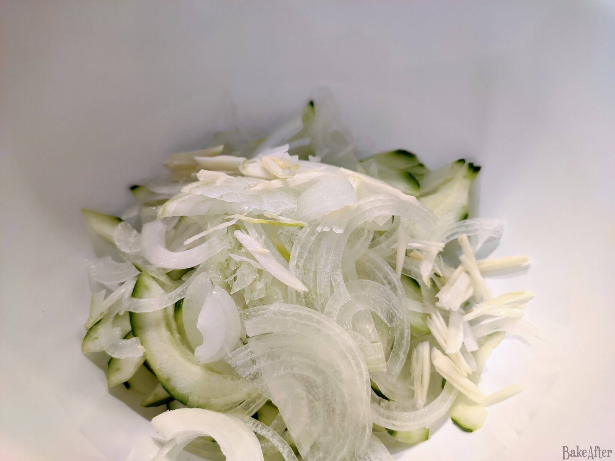 2. Now finely slice the cucumber, onion, and garlic (with a knife or mandolin), place everything on a cloth if you are going to wrap it up and squeeze it to remove as much moisture as possible.
