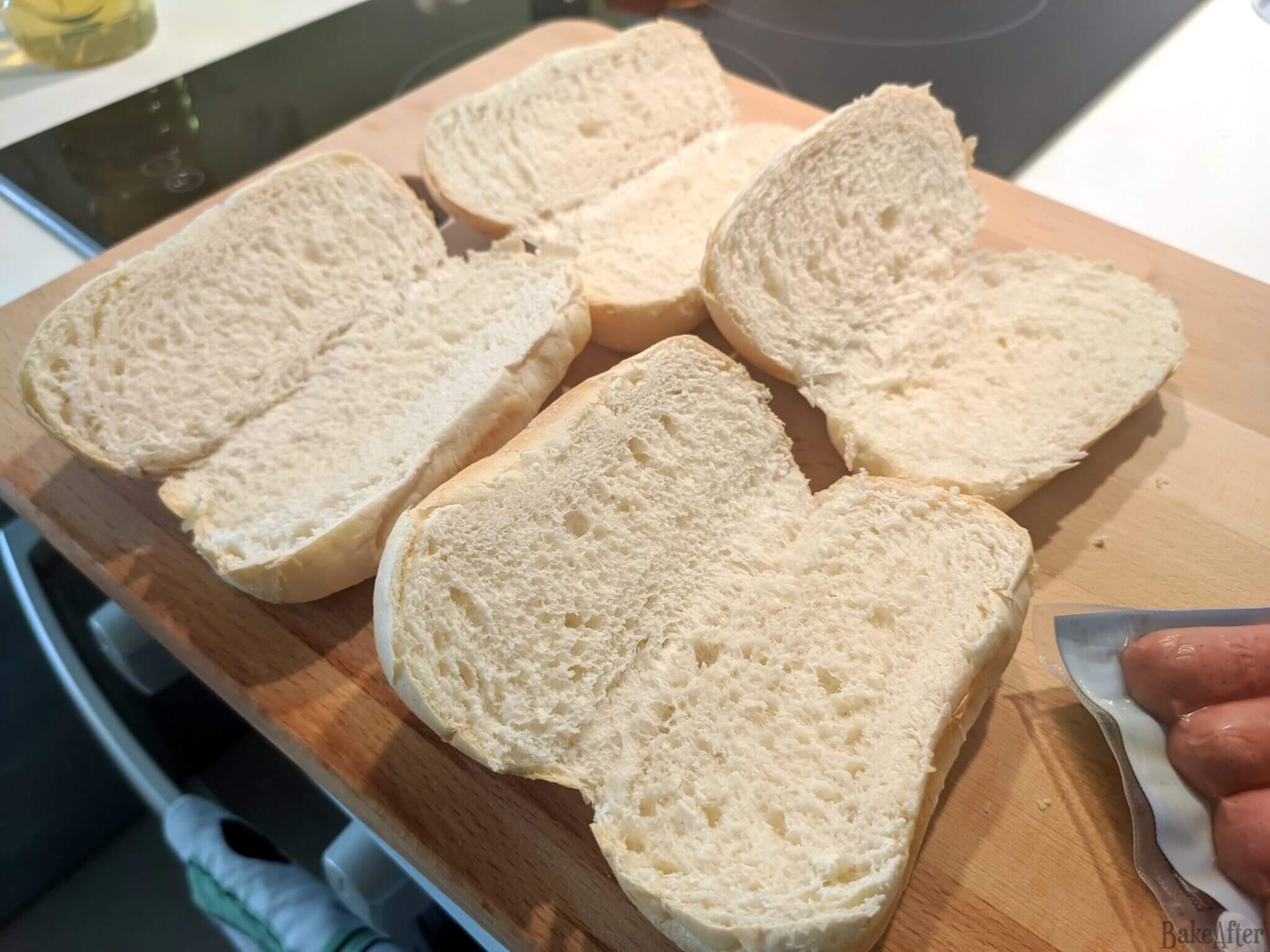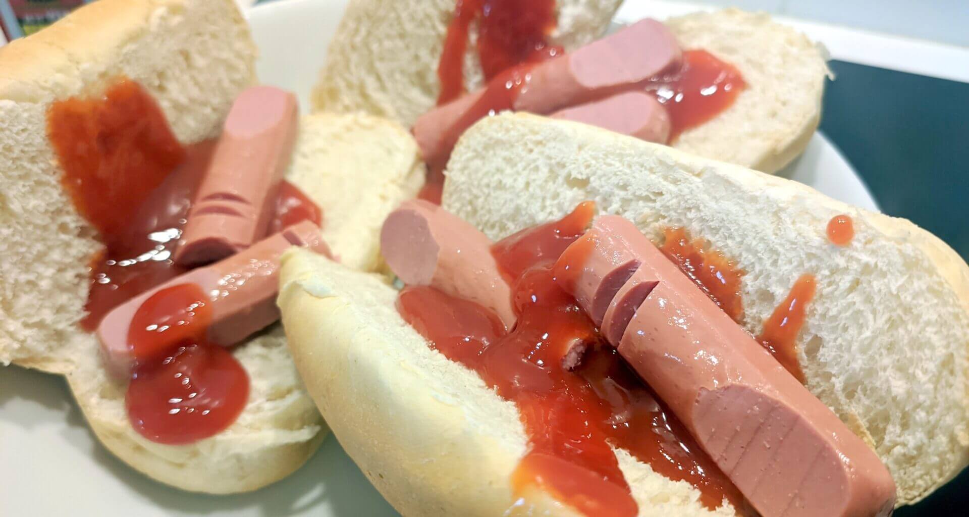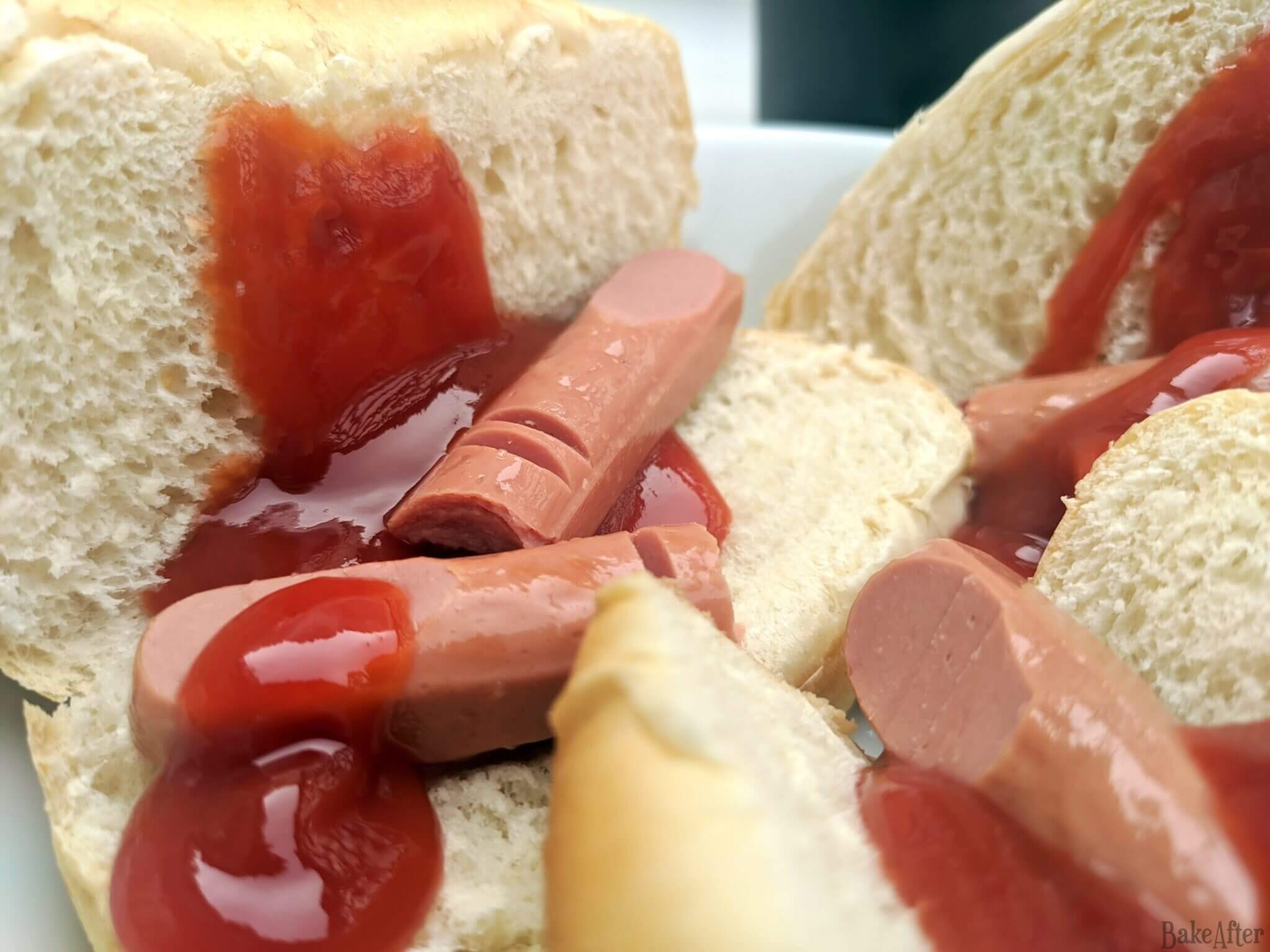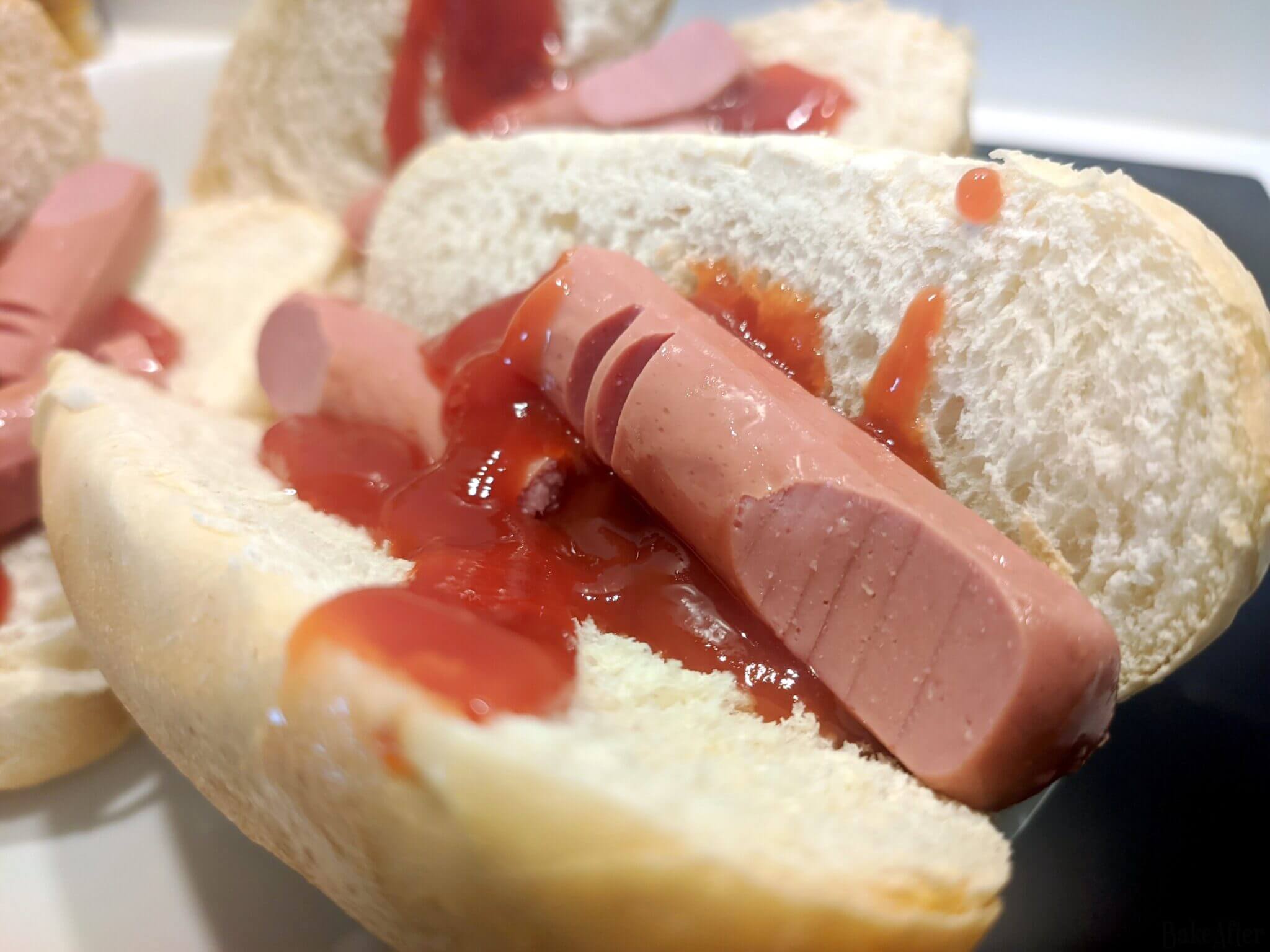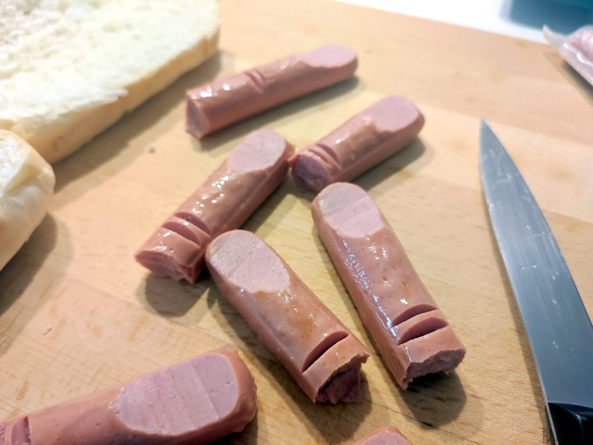 - The most important part is to find sausages that look like this. Usually, canned sausages are too round and have a paler color, so try to find sausages that are sold refrigerated in supermarkets. Many tend to be smoked like these and are therefore a little darker on the outside and have a more rectangular shape, which helps to create this finger-like appearance. For the hot dog buns, try to find small buns to give a better impression. If you can’t find any, buy regular ones and cut them in half.