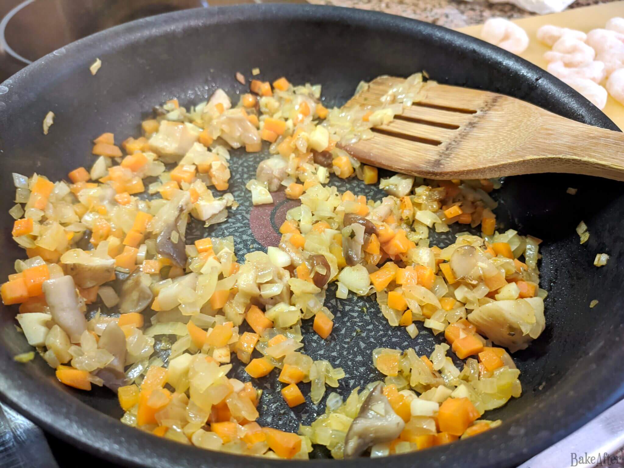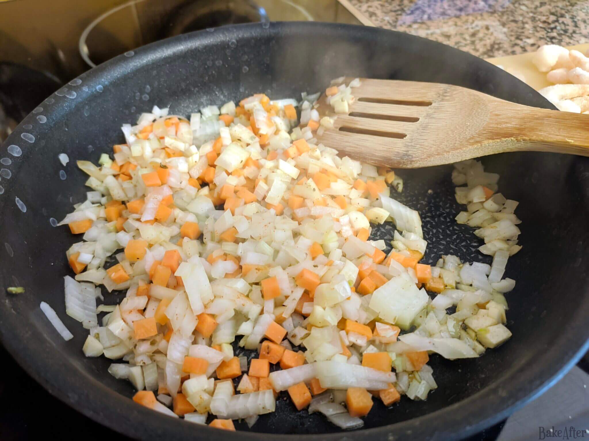 1. Start by starting a sautéing in a frying pan, add a drizzle of olive oil, followed by the finely chopped carrots, onions, and garlic, and leave to fry.