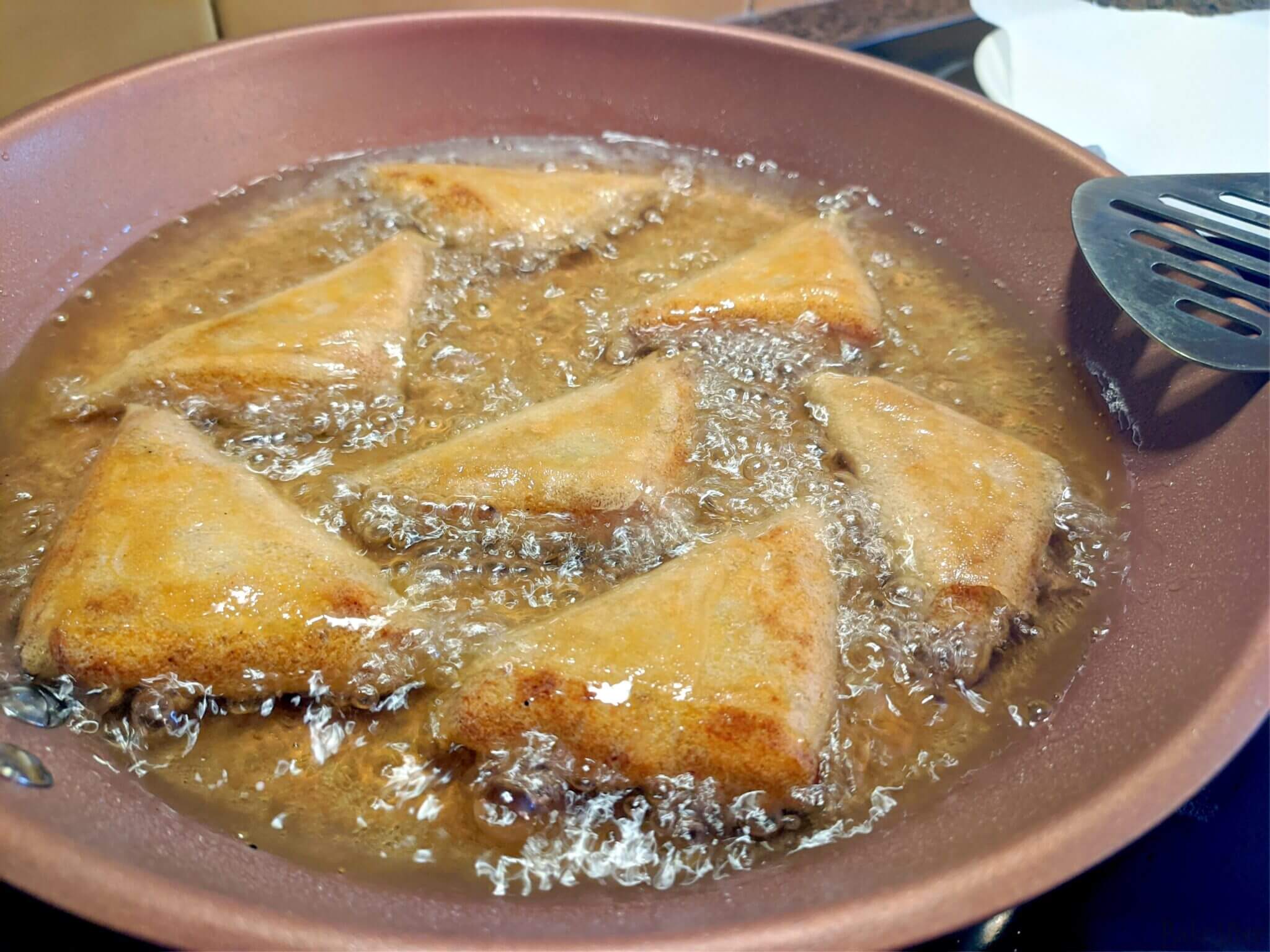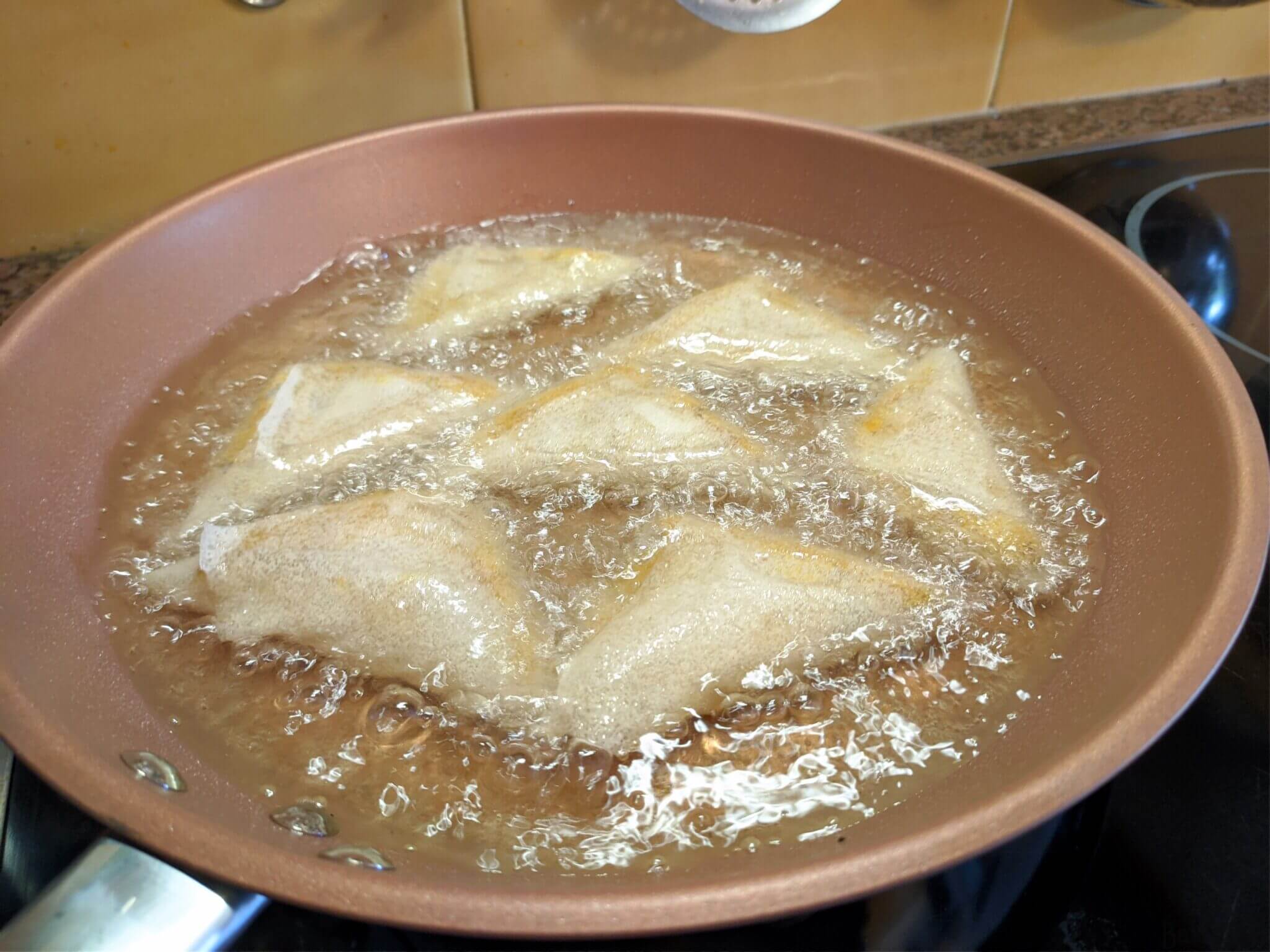 - Now repeat until you have no more dough or filling, then heat the oil and fry them until both sides are golden brown.