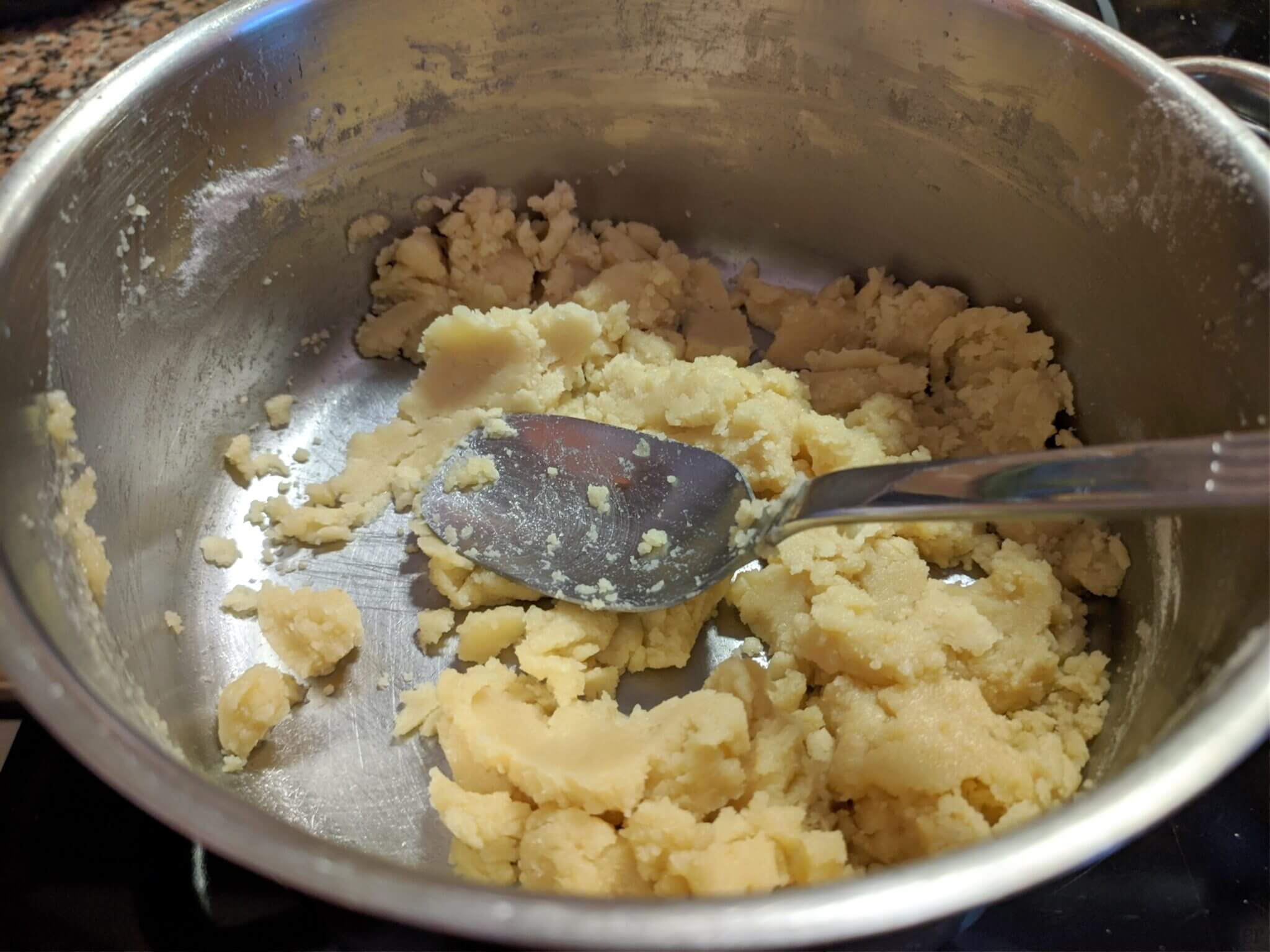 - While it is cooking, prepare the béchamel sauce. In a small saucepan, add the flour, butter, and a pinch of salt. Cook for a while until you create a ball of dough, then add a little hot milk, stir well, add a little more, and stir again. Repeat this process until you create a smooth cream, then remove from the heat.