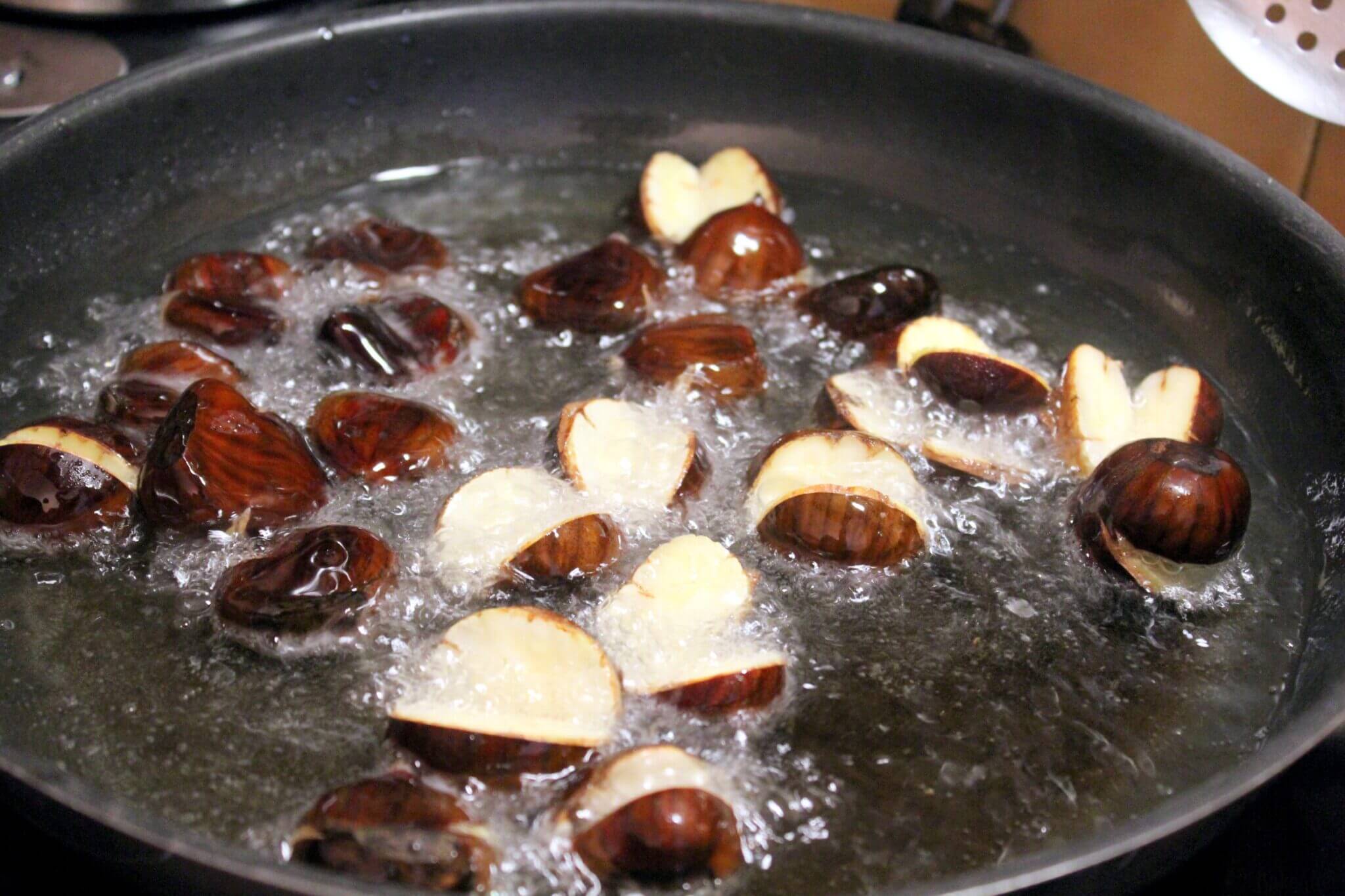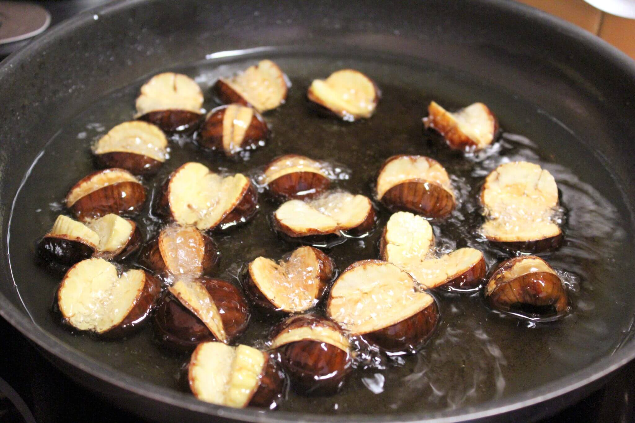 - Heat the oil over medium/high heat. When the oil is hot, add the chestnuts. In my case, I used half of the chestnuts; you don’t want to fill the pan with too many chestnuts.