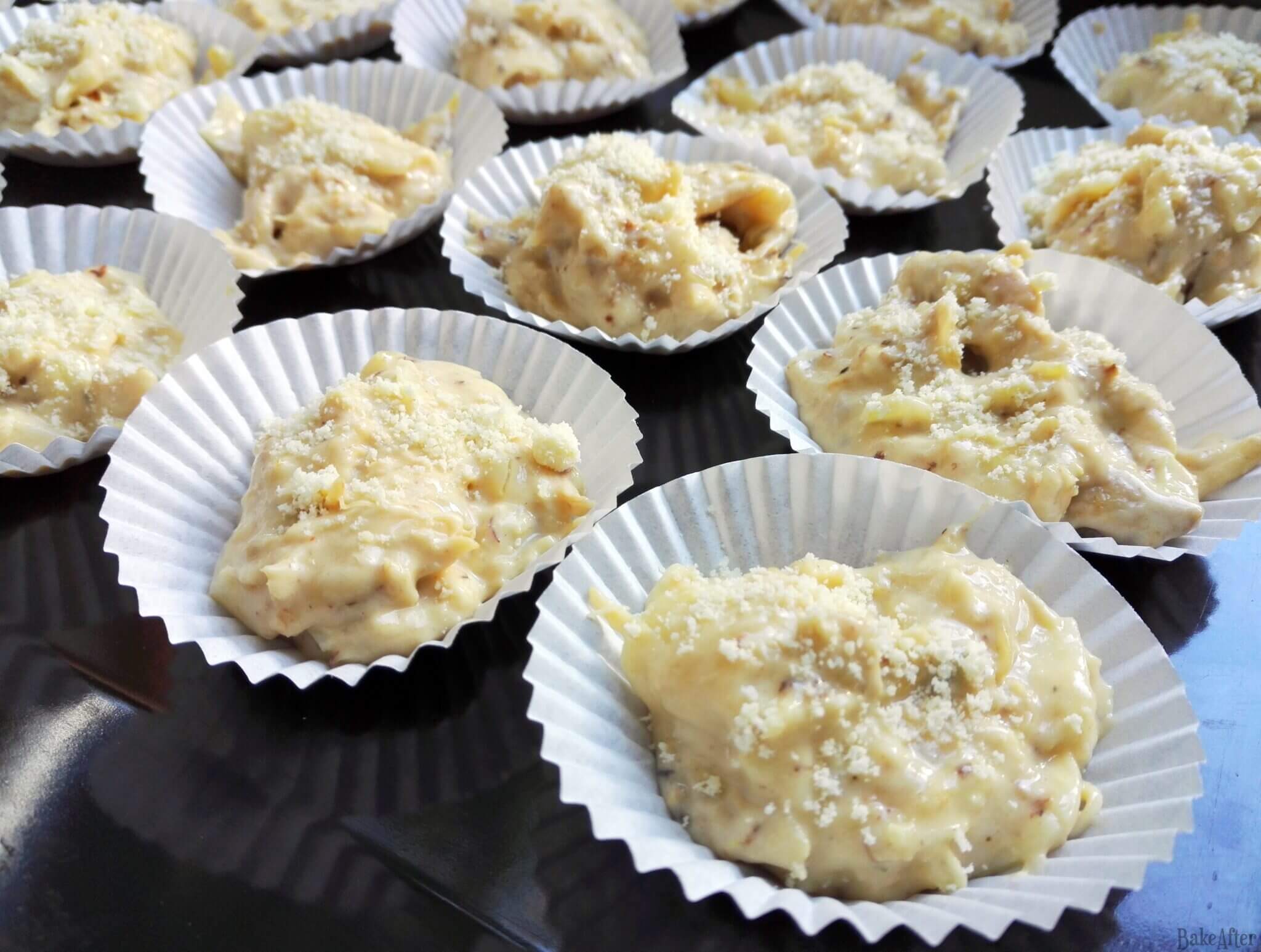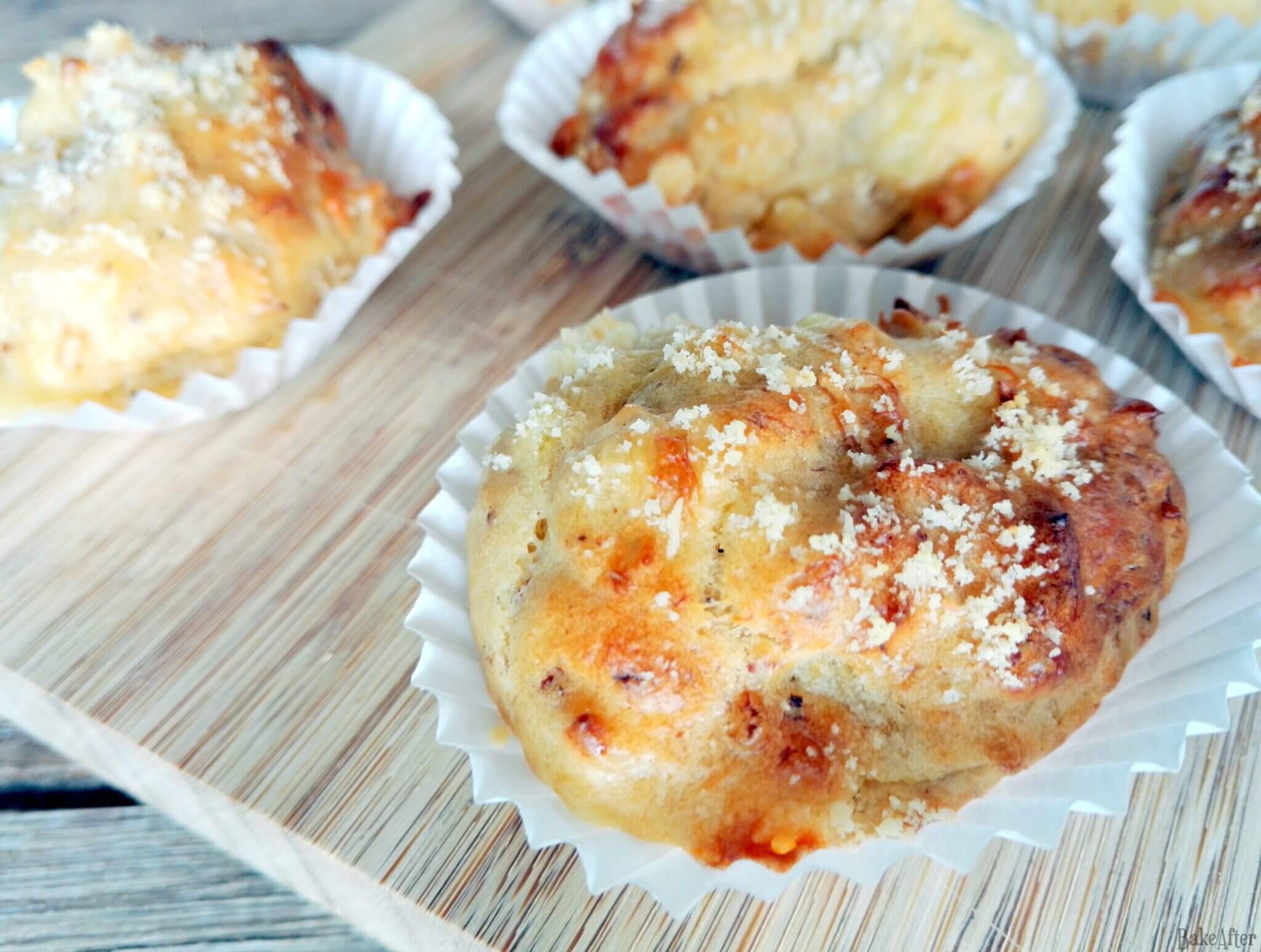 - Pour the mixture into each paper cupcake mold until there is no mixture left, then sprinkle each cupcake with plenty of grated Parmesan cheese.